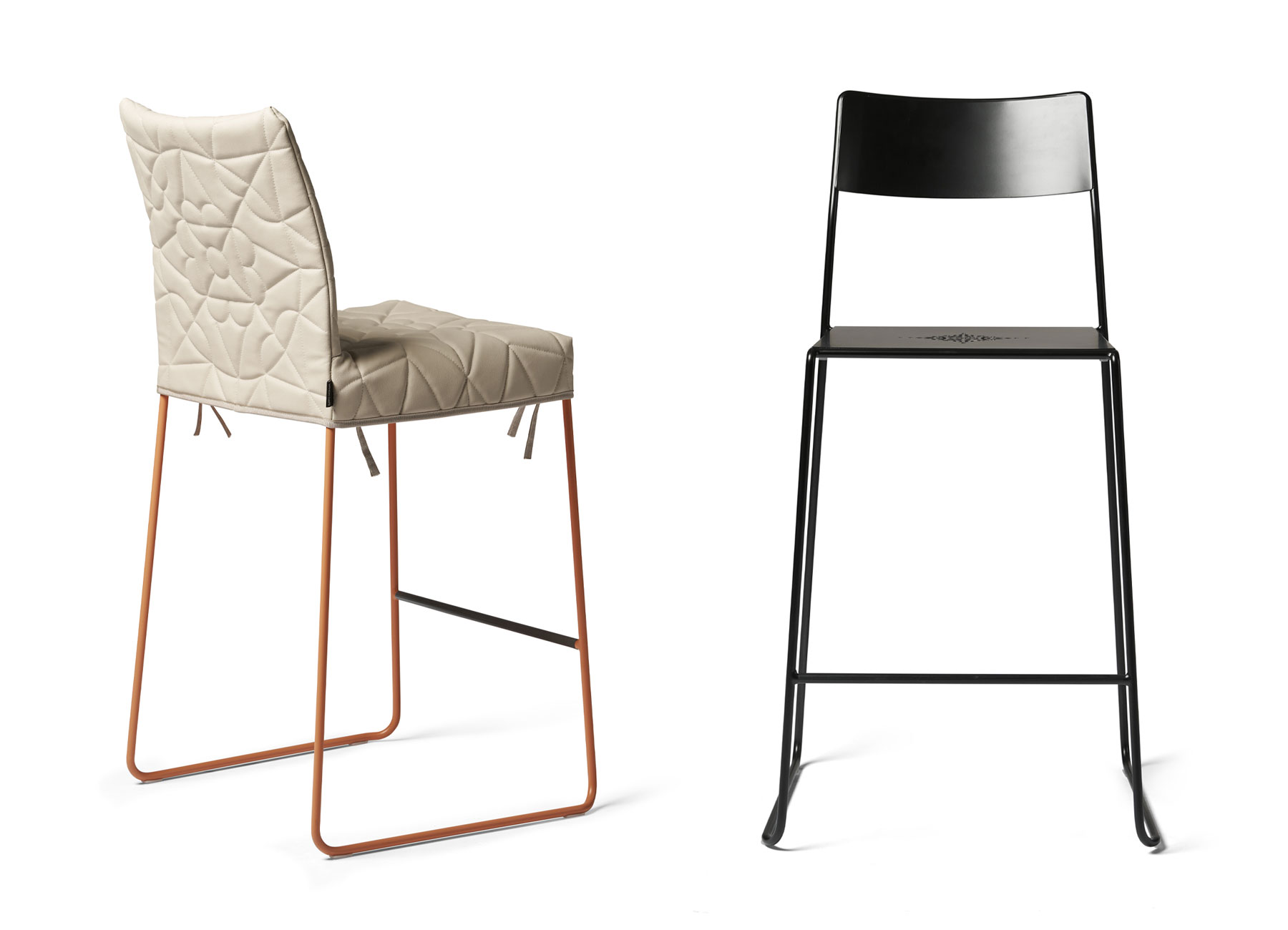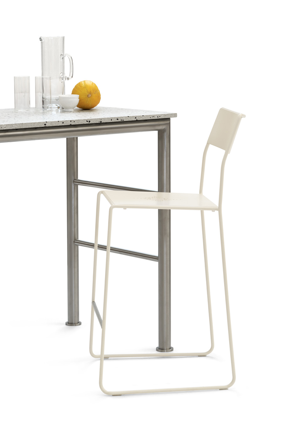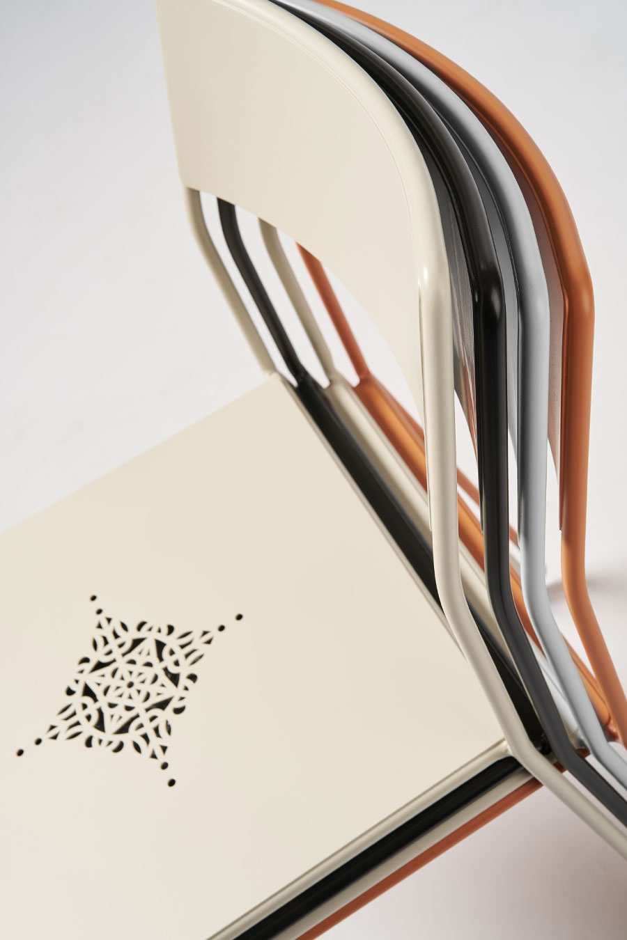 Made of steel, the chair and stool come with a simple, streamlined base that ensures both stability and comfort. The rened pattern of the seat is not just an aesthetic detail, but also serves a specic functional purpose: the perforated design allows water to drain, making the chairs and stools suitable for outdoor use as well.