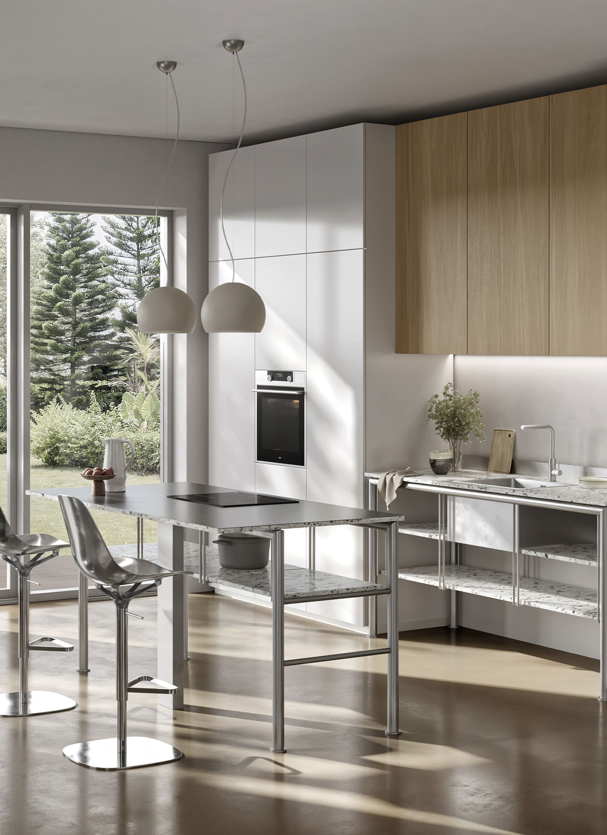 Il cuore del progetto resta la struttura a ponte, ora ripensata per garantire una maggiore versatilità. Disponibile in tre lunghezze – 74, 135 e 196 cm – permette di creare soluzioni su misura semplicemente accostando i moduli. L’altezza, portata a 95 cm, migliora l’ergonomia e consente l'integrazione agevole degli elettrodomestici sottotop. Infine, l’eliminazione del distanziale tra ponte e piano ha reso il design più pulito e continuo, riducendo al contempo spazi vuoti di transizione, facilmente sporcabili soprattutto negli ambienti outdoor. E proprio la possibilità di utilizzo all’aperto è una delle grandi novità di Axis 2025. Grazie alla selezione di materiali e finiture resistenti agli agenti atmosferici, il sistema può tranquillamente trovare collocazione en plein air. L’acciaio inox satinato della struttura, da sempre sinonimo di robustezza e igiene, è oggi sormontato da un piano realizzato in uno speciale materiale ecologico double-green. Inoltre, tra le finiture disponibili c’è il Corkcrete, l’innovativa malta a base di sughero e mescole naturali, il cui primo utilizzo sugli arredi si deve proprio a Opinion Ciatti. Oltre a garantire resistenza e durabilità ogni materiale e rivestimento è stata pensato per valorizzare al massimo la professionalità di chi utilizza la struttura, offrendo superfici specifiche per ogni fase della preparazione del cibo: il piano eco per il taglio, l’acciaio inox per accogliere pentole bollenti (un sovratop in acciaio inox può infatti essere applicato a copertura), il Corkcrete per ospitare i piatti su una superficie bella anche da toccare. Piedini regolabili, infine, permettono di adattare ogni modulo a qualsiasi superficie, comprese quelle più complicate degli spazi esterni.