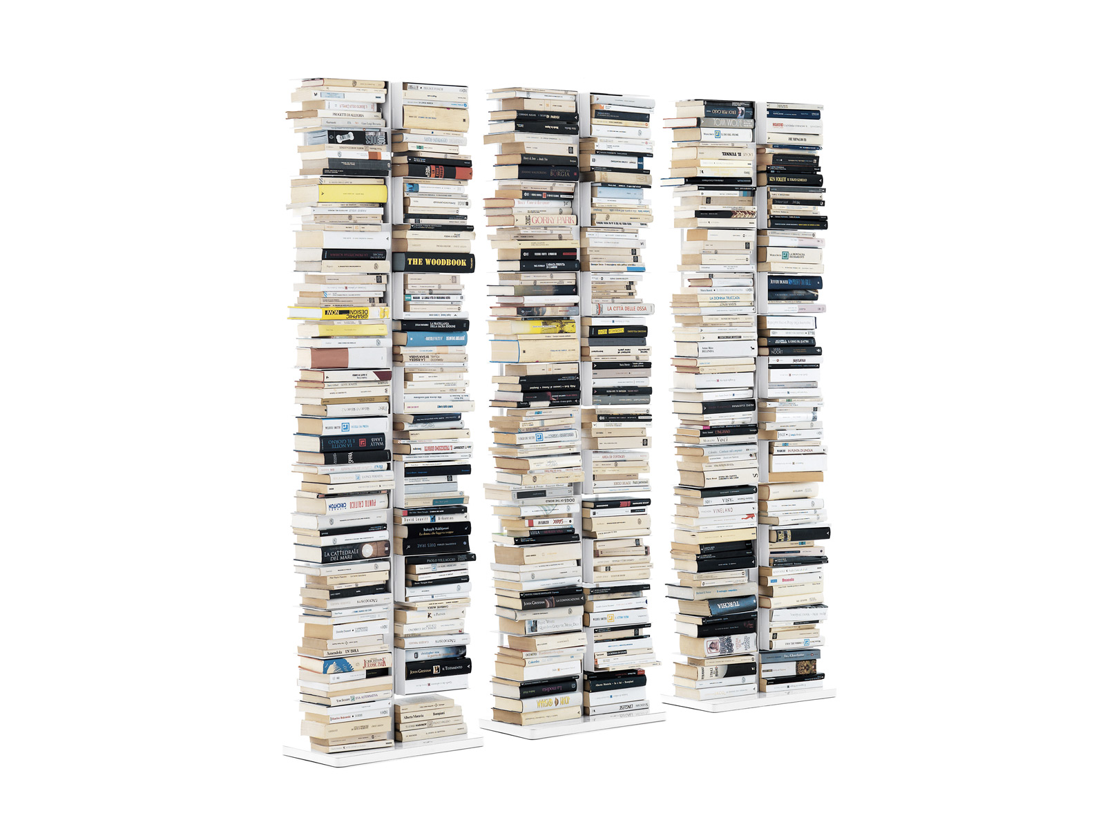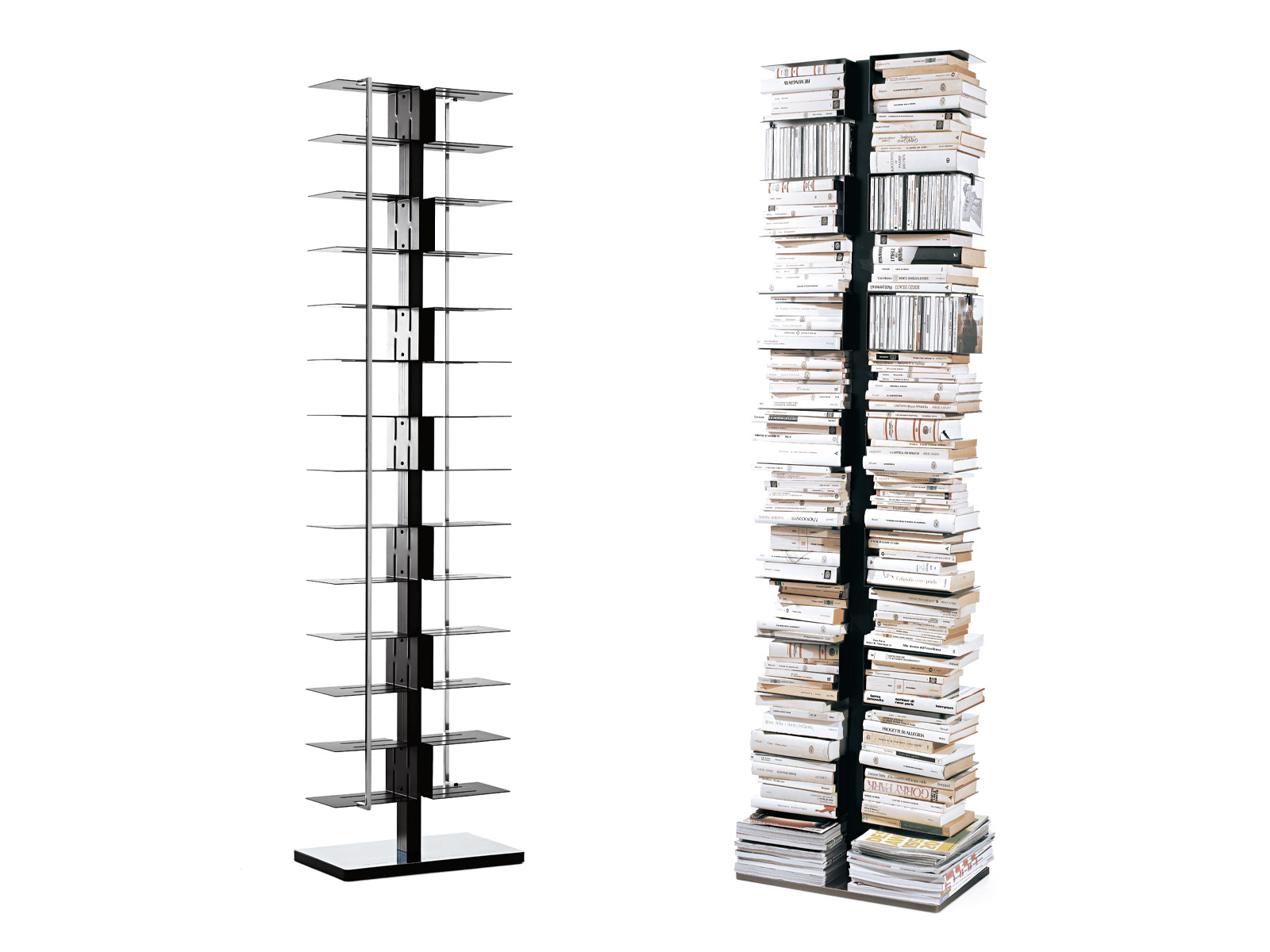 Realizzata in metallo laccato Ptolomeo x2 è assolutamente self standing ed è disponibile in due diverse finiture tutta laccato bianco lucido o laccato nero opaco per struttura e mensole con base in acciaio inox lucido. Le aste fermalibri sono sempre in acciaio inox lucido.